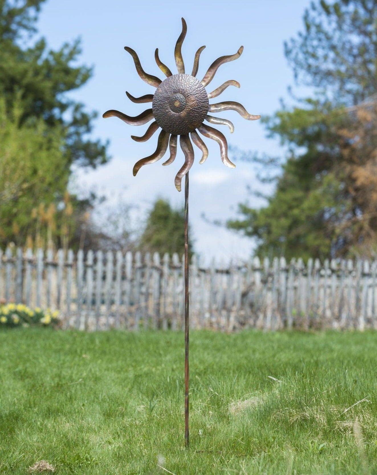 - Features a sun with rays atop a long garden stake